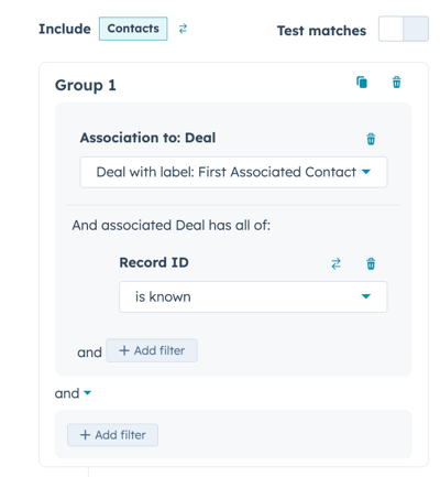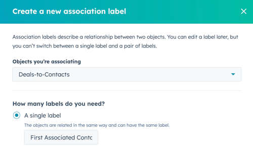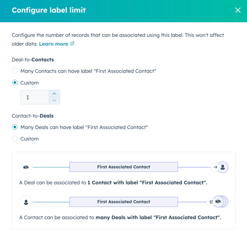 This setup ensures each deal can only have one “First Associated Contact,” while a single contact can hold that label for multiple deals. For example, if a contact is associated with two deals, they could still be the “first” for both - but each deal should only have one first contact.