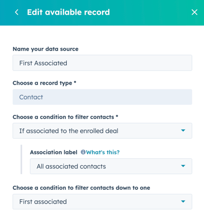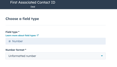 This property will be used to copy over the Record ID of the contact that’s first associated with the deal.