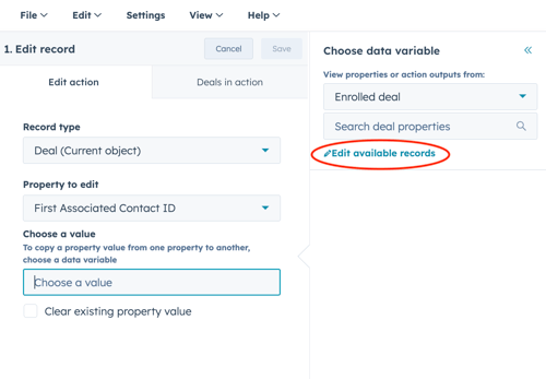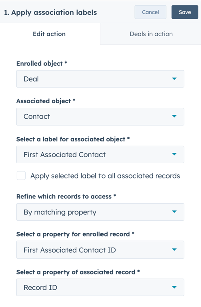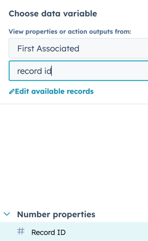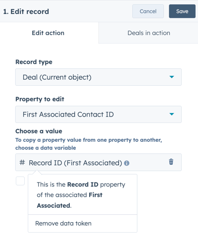 Once that’s set, the first (and last) step in this workflow is to copy the Record ID of the first associated contact into the property we just created.