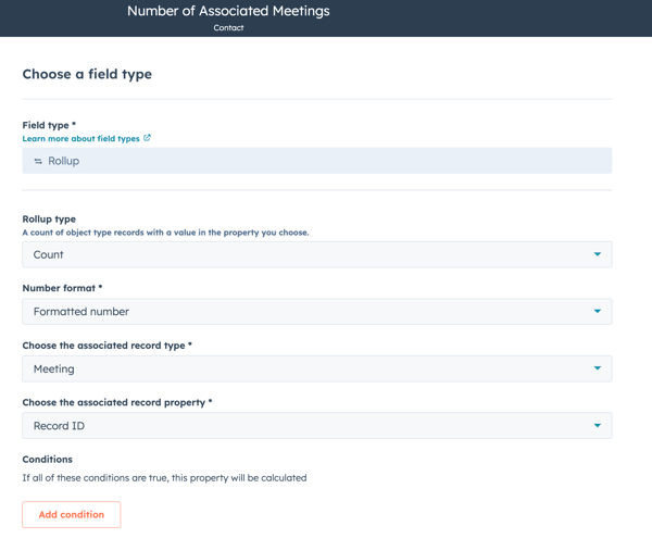 Note: When you create a rollup property, HubSpot will show a value of 0 for contacts with no associated meetings. That technically counts as a known value, even though it means “none.”