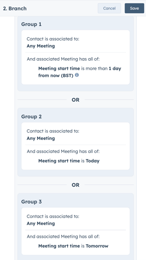 You’ll also notice the trigger is slightly different. Instead of using the Number of Associated Meetings, it uses Record ID is known from any associated meeting. This is because, in HubSpot, a value of 0 is still considered “known.” I don’t want every single contact going through this workflow, and they don’t need to - so this setup only triggers for contacts who have ever had a meeting logged against them.